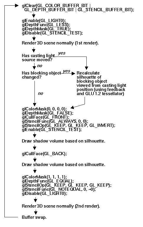 I don't have time here to go into all the gory details of how the algorithm works. It uses OpenGL's stenciling capability (a rendering capability totally unsupported by Direct3D). The flow chart below shows a simplified view of the key points in the algorithm (for one object with one light source as in shadowfun.c).