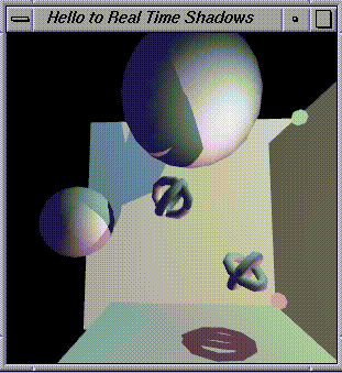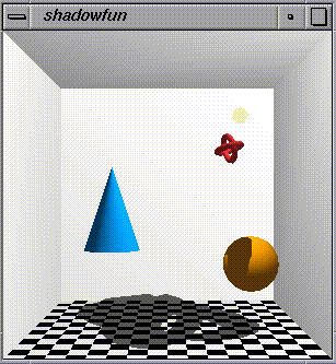 The source code and screen snapshots below demonstrate real-time shadows cast by object of arbitary shape onto arbitary geometry. The shadows are not the simple "planar shadow projections" so common in games and 3D graphics demos today. These shadows can be cast onto curved surfaces and can even be cast by objects with holes in them. The programs shown run at more than 15 frames per second on my SGI workstation. It could go faster with further tuning.
